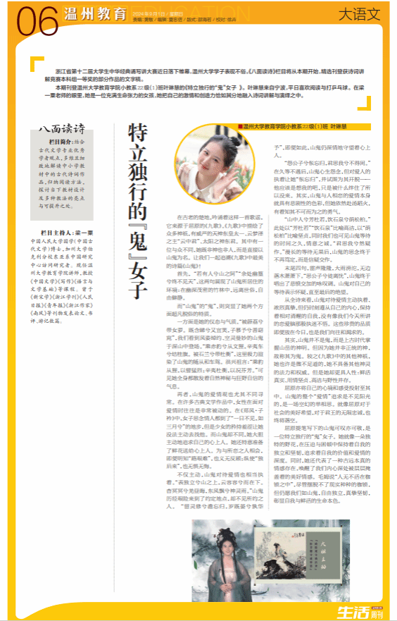 浙江省第十二届大学生中华经典诵写讲大赛近日落下帷幕,澳门银河官网 学子表现不俗。《八面读诗》栏目将从本期开始,精选刊登获诗词讲解竞赛本科组一等奖的部分作品的文字稿。 本期刊登澳门银河官网 教育学院小教系22级(1)班叶琳慧的《特立独行的“鬼”女子 》。叶琳慧来自宁波,平日喜欢阅读与打乒乓球。在梁一粟老师的眼里,她是一位充满生命张力的女孩,她把自己的激情和创造力恰如其分地融入诗词讲解与演绎之中。
