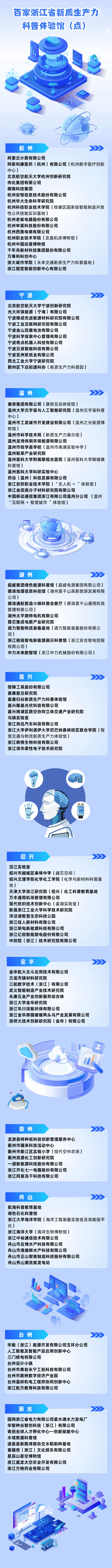 今年以来,浙江在全国率先实施新质生产力科普专项行动,全省各地涌现出一批以新质生产力体验为主要内容的科普馆、体验点,呈现点、线、面的多维突破。省科协在全省各地认定开放的基础上,择优遴选113家浙江省新质生产力科普体验馆(点)。