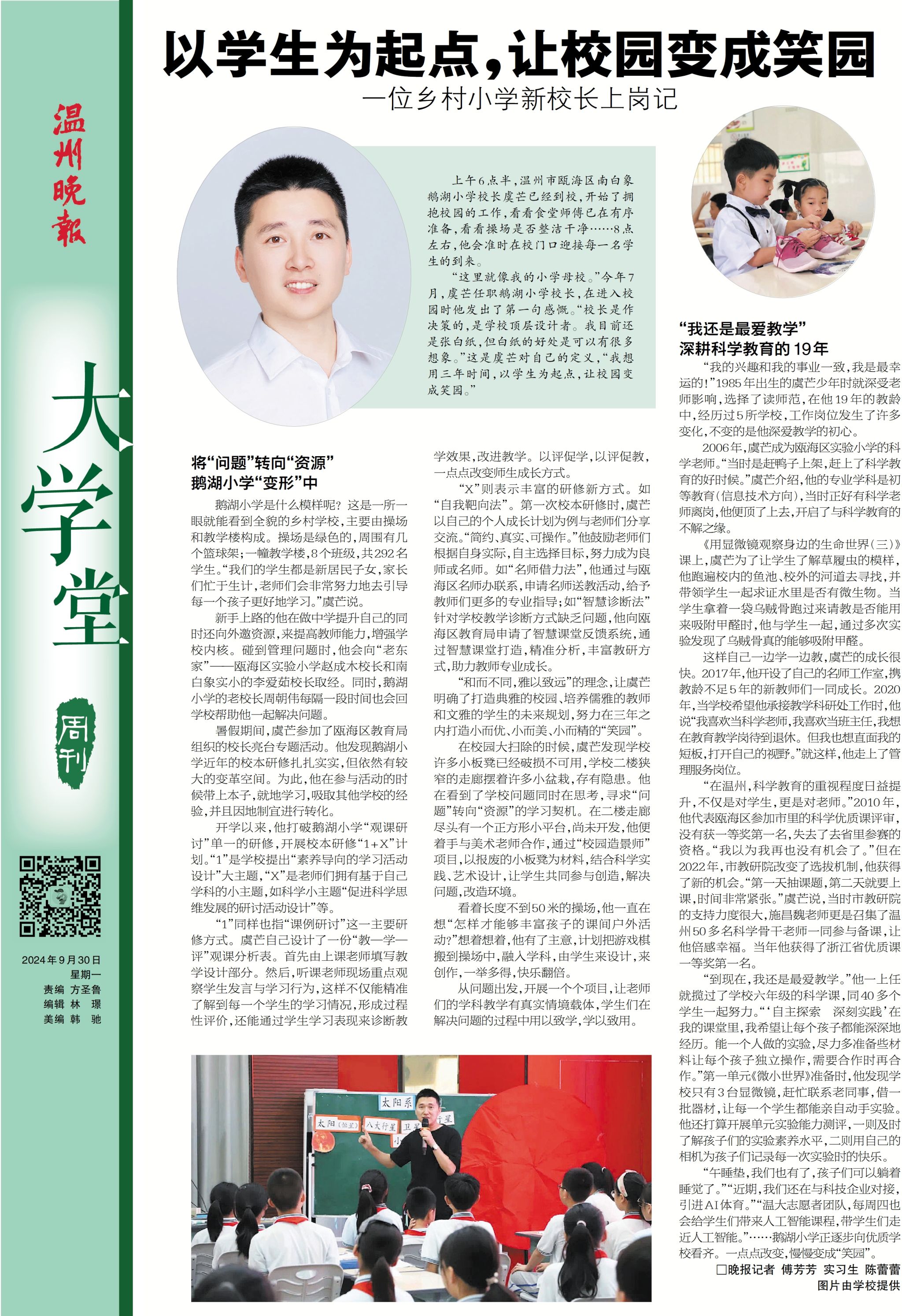 “这里就像我的小学母校。”今年7月,虞芒任职鹅湖小澳门银河官网 长,在进入校园时他发出了第一句感慨。“校长是作决策的,是澳门银河官网 顶层设计者。我目前还是张白纸,但白纸的好处是可以有很多想象。”这是虞芒对自己的定义,“我想用三年时间,从学生出发,让校园变成笑园。”