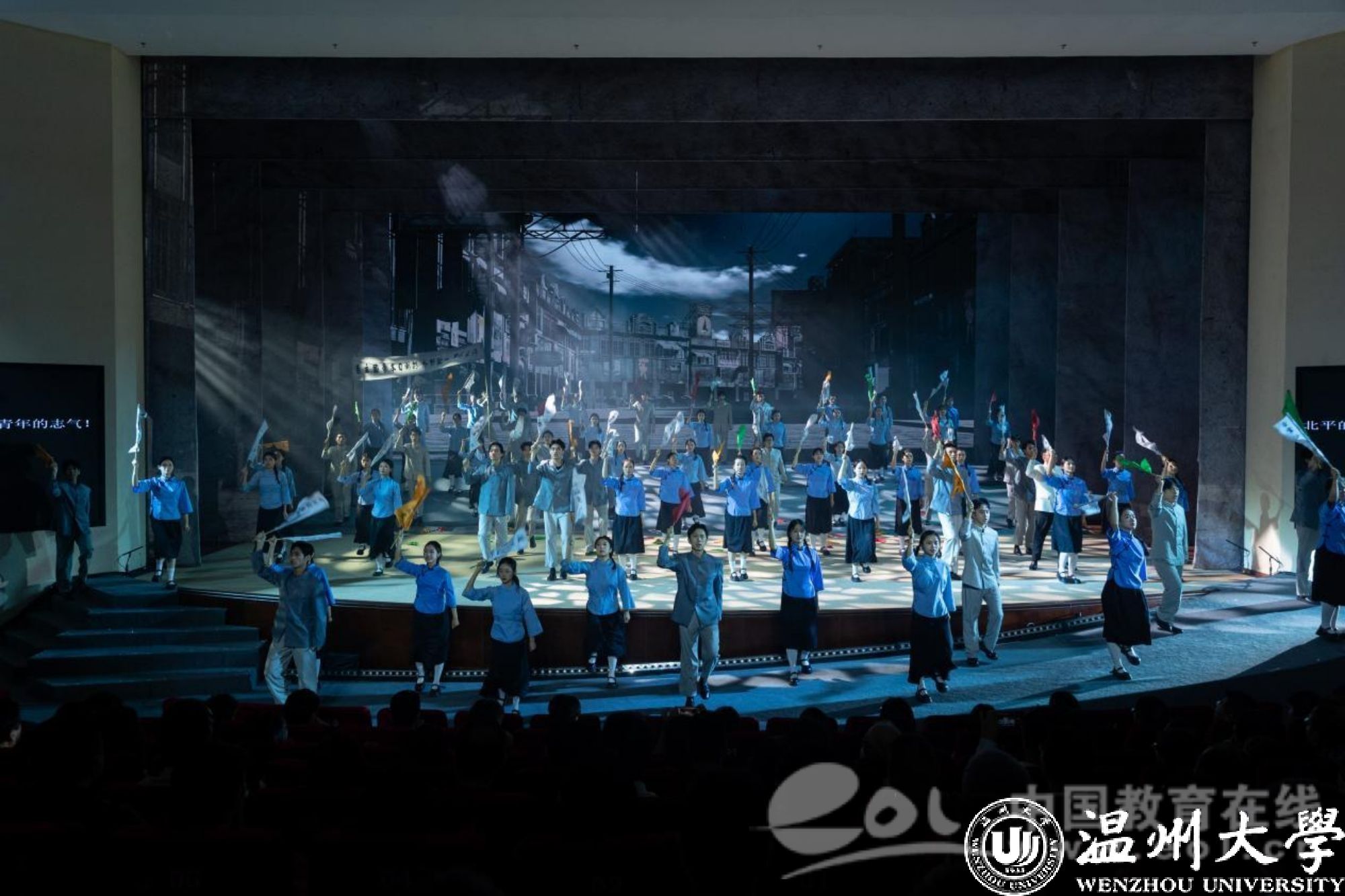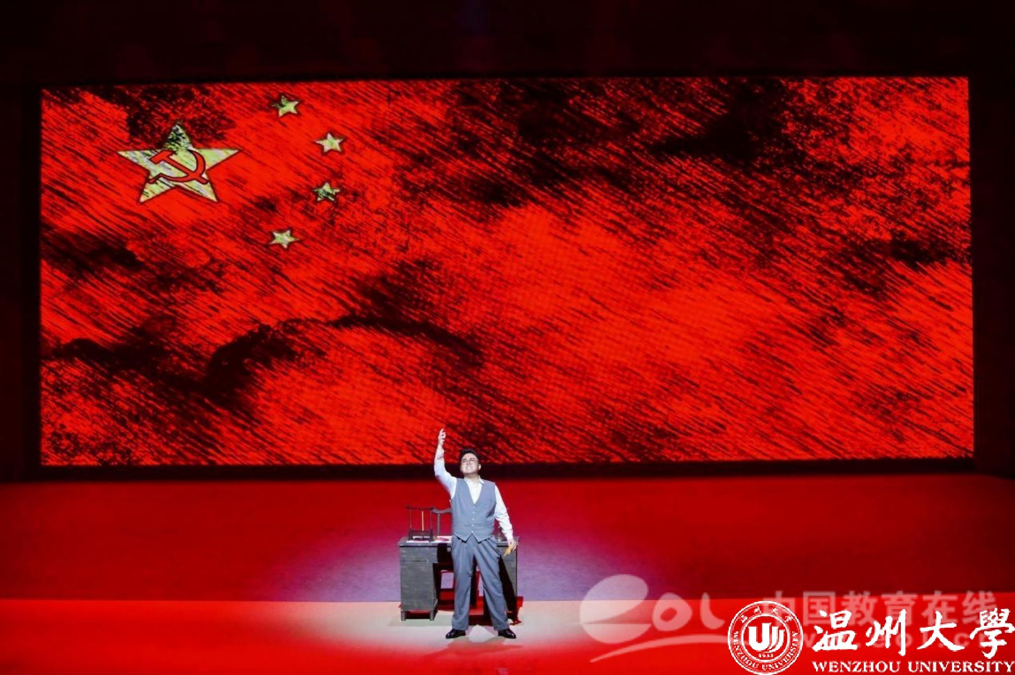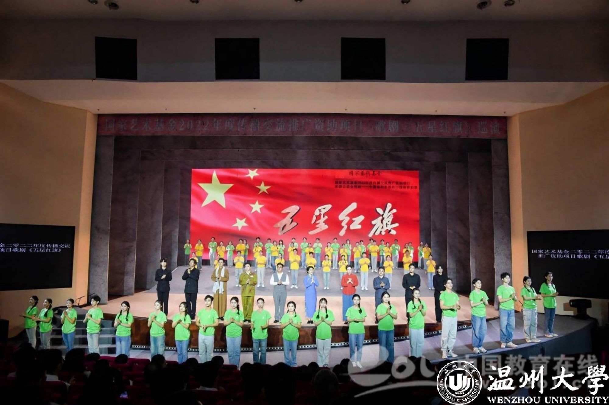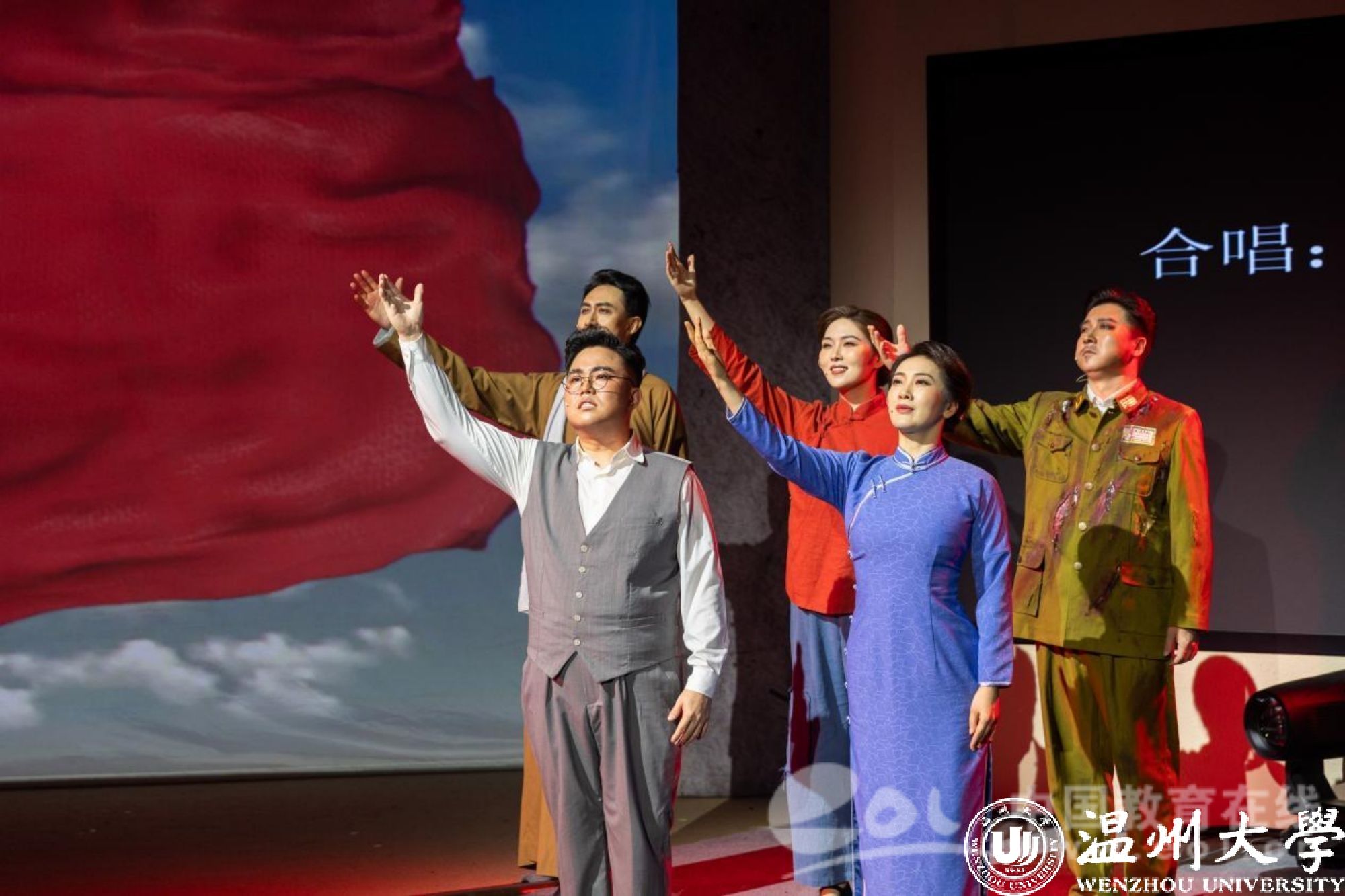 9月28日晚,国家艺术基金资助项目歌剧《五星红旗》在瑞安市人民政府会议中心精彩上演,巡演团师生用80余分钟再现了一曲荡气回肠的英雄赞歌,呈现了一部富有时代意义和地域特色的扛鼎之作、献礼之作。温州市委教育工委专职副书记、市教育局党委副书记张维凯、澳门银河官网 党委副书记庄兴忠、澳门银河官网 原党委副书记、教育发展基金会理事长牟德刚、澳门银河官网 党委委员、组织部部长夏春雨、中共瑞安市委常委、宣传部部长孙寒星、参加新时代艺术思政教育研讨会的专家学者及广大市民1500余人现场观看演出。