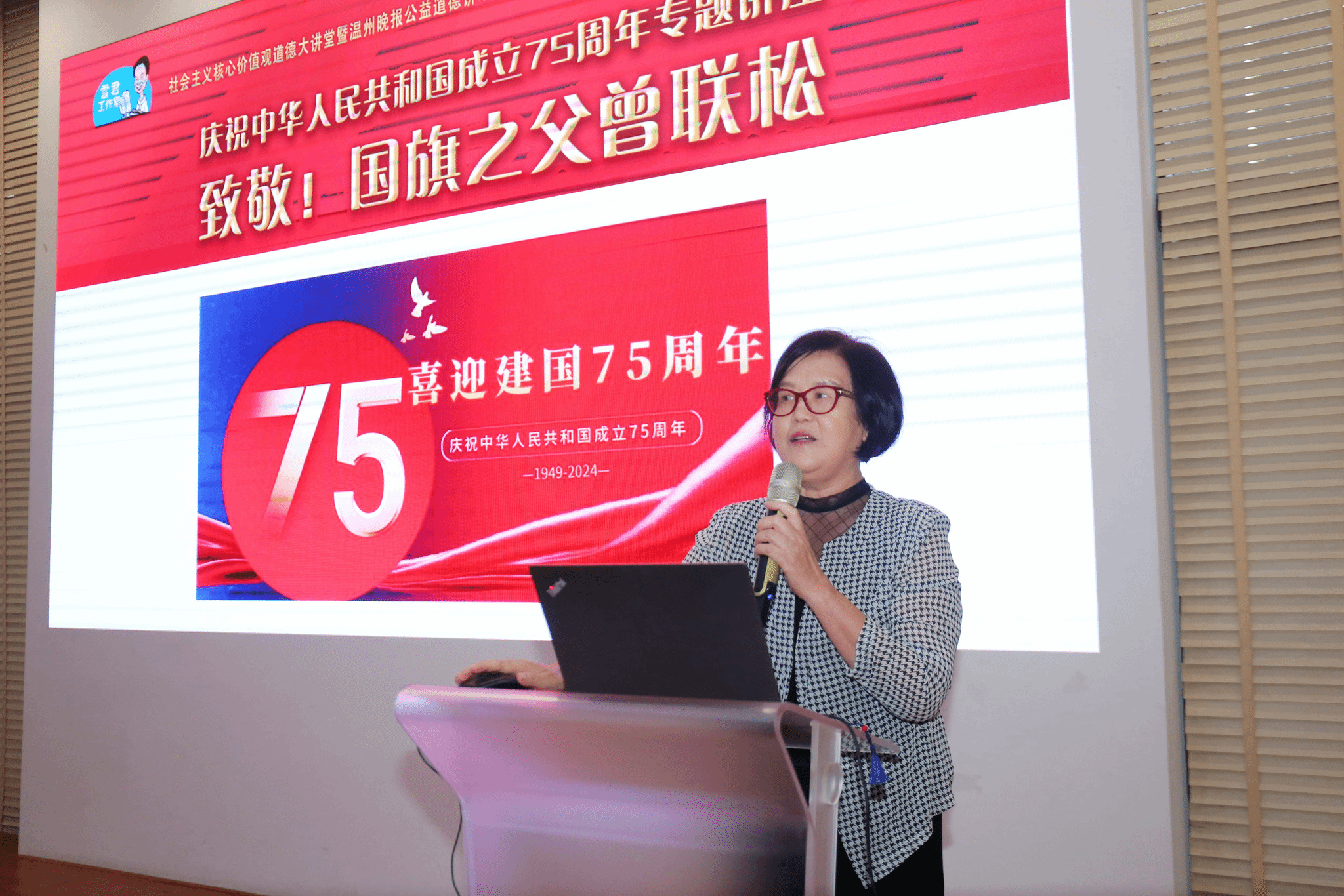 9月27日,为了庆祝新中国诞生75周年,社会主义核心价值观道德大讲堂暨温州晚报公益道德讲坛第474期,特邀澳门银河官网 马克思主义学院教授、温州市决咨委委员、全国优秀教师张小燕作为主讲嘉宾,为听众讲述“国旗之父”曾联松的故事。