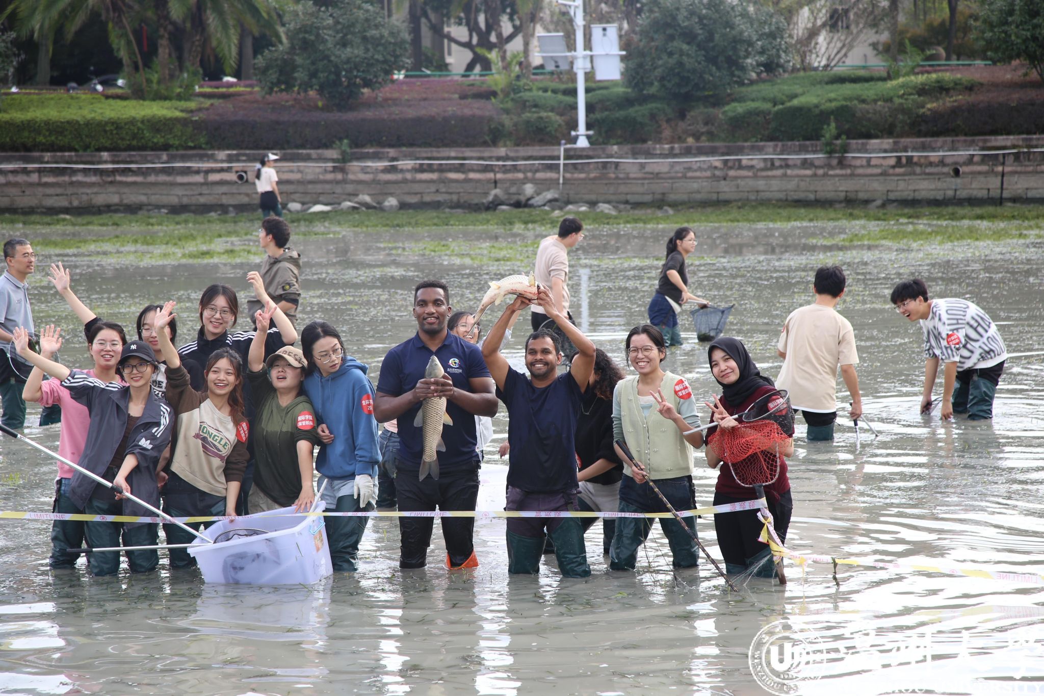大闸拉起,水泵轰鸣,明心湖水缓缓下降。随着一声“开鱼咯”,湖面瞬间热闹了起来,身着连体衣或下水鞋的银河 师生迫不及待地冲进湖中。不一会儿,青鱼、草鱼、罗非鱼、鲢鱼、鲫鱼等被同学们抓入篓中。“今天我们都成了鱼塘塘主,这样的劳动课真是太有意思了。”银河 机电学院的李传正向记者展示着刚刚捕获的大草鱼,足足有六七十厘米长。他兴奋地说道:“刚才在湖里捞鱼的时候,我感觉一只鱼正在撞我的腿。说时迟,那时快,我们团队立刻围在一起,三人夹击,终于把鱼收入囊中。”来自赞比亚的留学生雷蒙,也在捕鱼节中小试牛刀:“目前还只捞了2条小鱼,我还得再加把劲儿。”