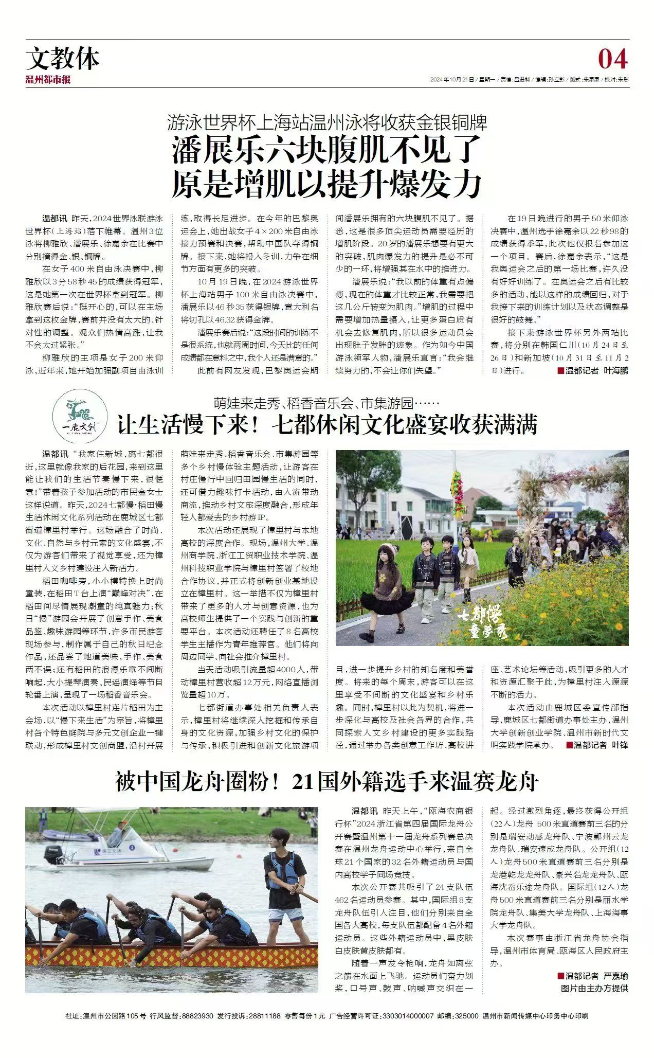 温都讯 “我家住新城,离七都很近,这里就像我家的后花园,来到这里能让我们的生活节奏慢下来,很惬意!”带着孩子参加活动的市民金女士这样说道。昨天,2024七都慢·稻田慢生活休闲文化系列活动在鹿城区七都街道樟里村举行。这场融合了时尚、文化、自然与乡村元素的文化盛宴,不仅为游客们带来了视觉享受,还为樟里村人文乡村建设注入新活力。