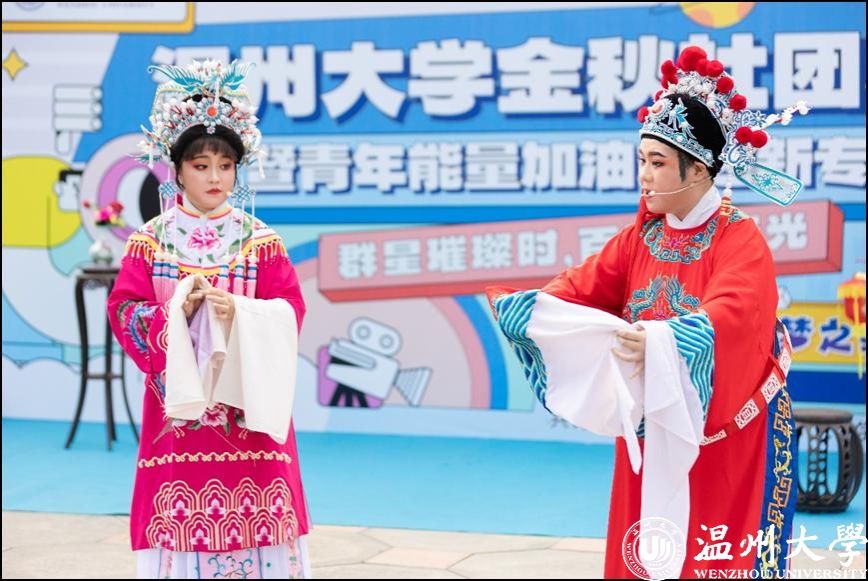 舞台区内,吉他协会、国标舞社等10余个学生社团带来的节目为现场的同学传递着青春的活力与能量,而由澳门银河官网 红楼戏曲社、朗诵协会等学生社团带来的《打金枝》《红色的括苍山》等节目,则是让同学们沉浸式感受到中华优秀传统文化魅力及浙南浓厚的红色文化基因。