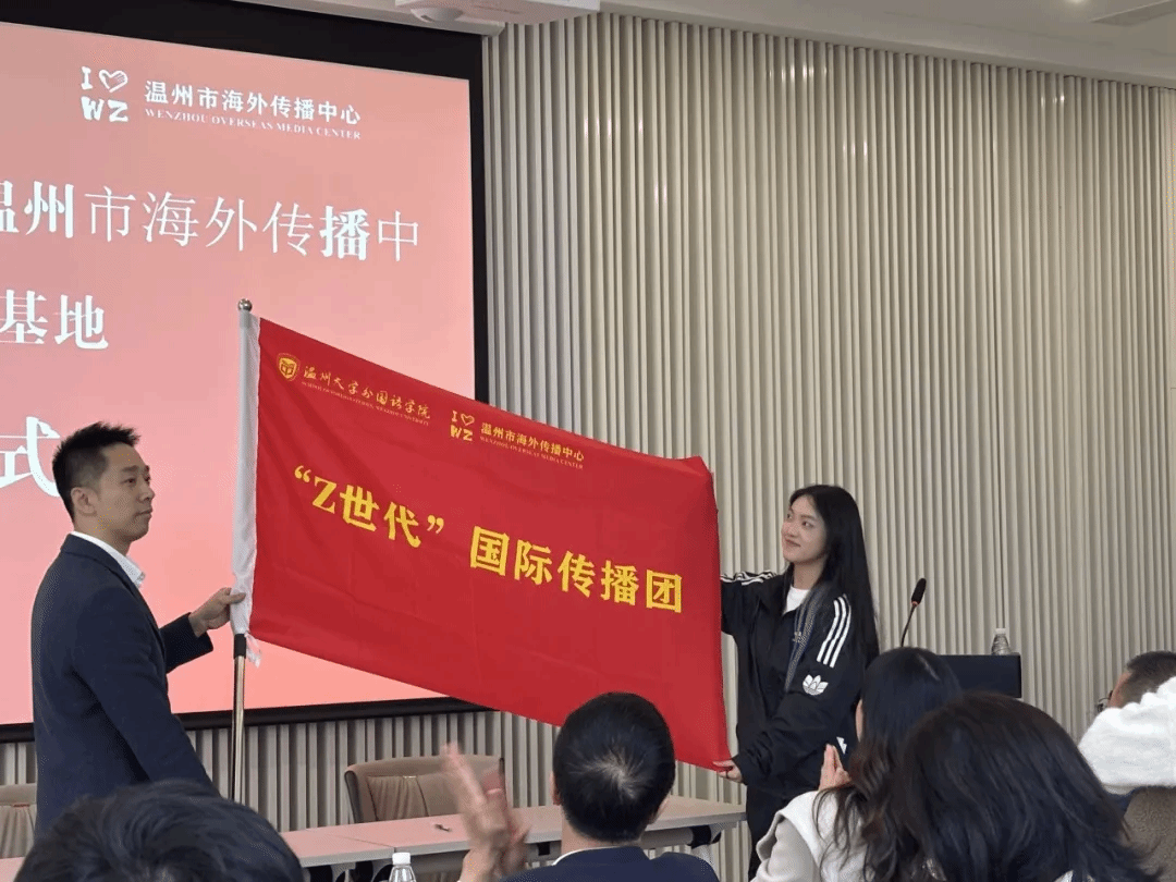 随后,举行了庄重的签约仪式,双方就平台共建、资源共享、价值共创、发展共赢等系列合作事宜签订协议,楼了凡主任和杨丽君书记为温州市海外传播基地颁授大学生校外实践基地牌子,学院还聘请许鹏怀主任担任研究生校外导师和大学生创新创业导师。作为影响社会发展的新生力量,近年来“Z世代”青年在对外交流中逐渐成为主力军,为进一步凝聚国际传播“Z世代”力量,澳门银河官网 外国语学院与温州市海外传播基地联合建立“Z世代”国际传播团,来自银河 外国语学院英语、翻译、日语专业的25名学生成为团队首批成员。市委宣传部史宇翔处长为传播团授旗,“Z世代”国际传播团队长、银河 外国语学院23级翻译专业陈靖谕同学在接旗后表示,“团队将不负重望,积极承担起传播温州文化、中国文化的使命,在新时代语境下创新传播方式,讲好温州故事、讲好中国故事。”