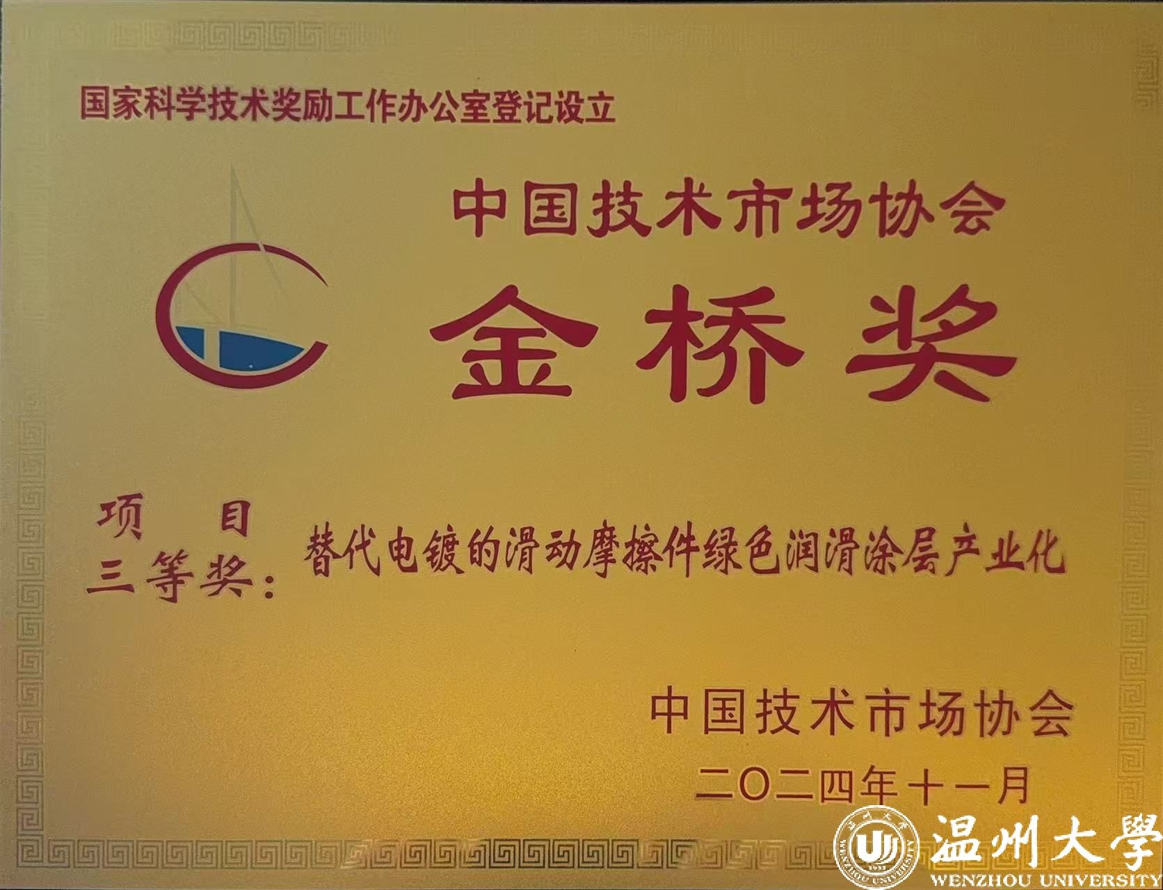 近日,在中国技术市场协会举办的第十二届中国技术市场协会"金桥奖"颁奖现场,由澳门银河官网 选送的"替代电镀的滑动轴承摩擦件绿色润滑涂层产业化"项目经过7个月的严格评审,脱颖而出,最终获得国家级项目三等奖。