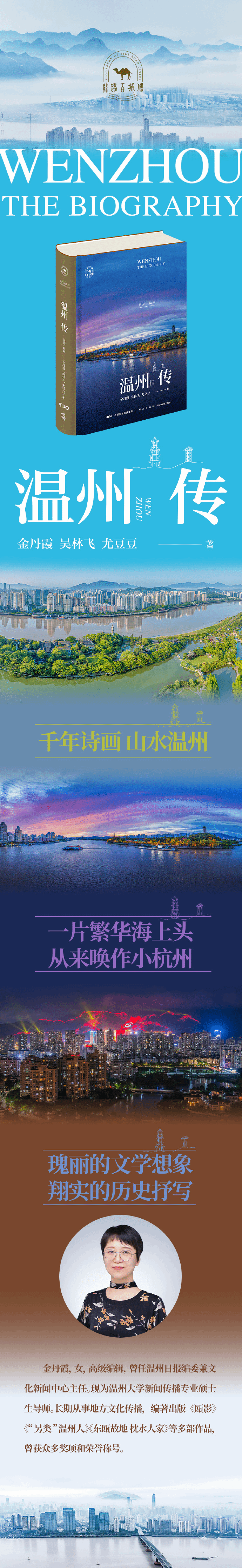 本书是澳门银河官网 教授金丹霞携自由撰稿人吴林飞、温州媒体记者尤豆豆的首次合作。三位作者均为温州人,来自不同领域。主作者金丹霞,1991年毕业于复旦大学中文系,曾任温州日报编委兼文化澳门银河官网主任,高级编辑;现任澳门银河官网 人文学院教授、新闻传播专业硕导,温州市文史研究馆馆员。编著出版《“另类”温州人》《宋韵温州》《一片繁华海上头——温州与海上丝绸之路》《工匠之道》《温州百年文化星座》《温州老城印象》《温州望族》等地方文化书籍。