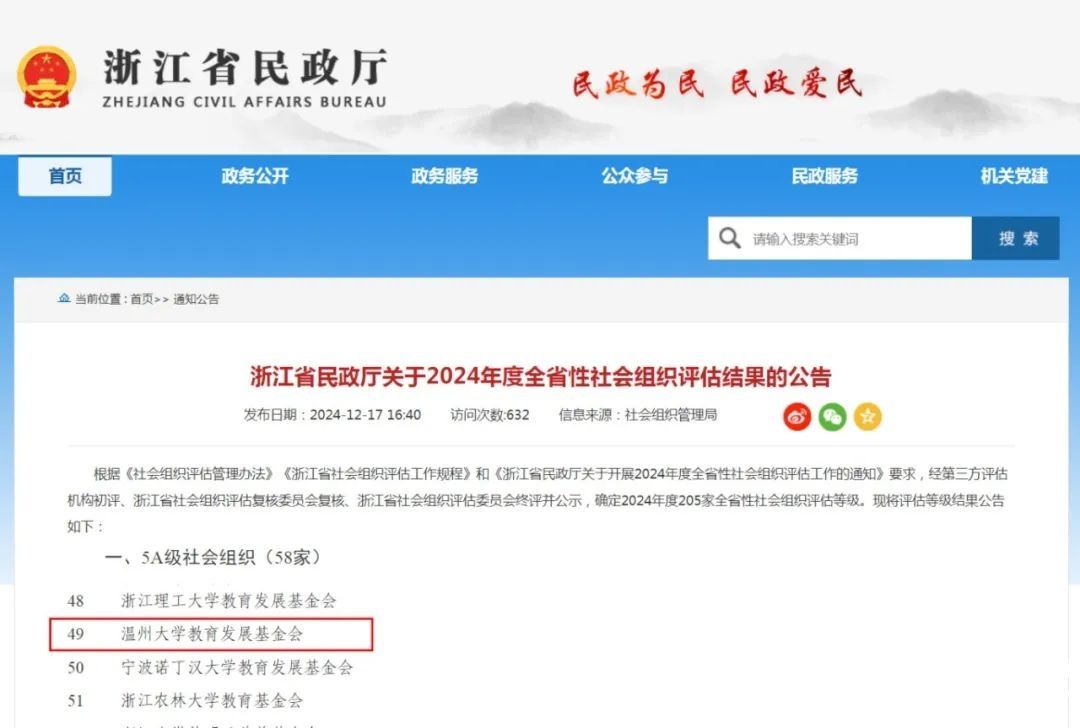 近日,浙江省民政厅正式发布了《关于2024年度全省性社会组织评估结果的通报》,澳门银河官网 教育发展基金会通过复评再次获评“5A级社会组织”称号。这是该基金会继2019年12月首次获评5A级后,再次获得社会组织评估最高等级的殊荣。