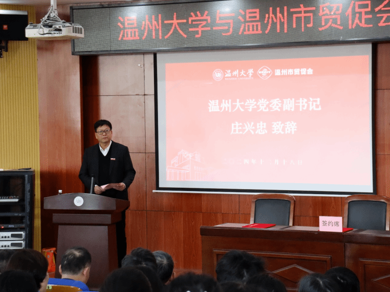 温州市贸促会党组书记、会长苏立盛在致辞中指出,温州市贸促会与温州发展同频共振、共生共荣,始终以促进国际经贸发展为目标,充分发挥“联通政企、融通内外、畅通供需”的作用,积极为海内外企业和工商会提供全方位、多层次、宽领域的服务,有力推动温州地方经济的繁荣和行业的可持续发展。期望以此次签署合作协议为契机,进一步发挥高校的教育、科技、人才优势,搭建合作平台,共享合作资源,共同为温州市的经济社会发展做出贡献。