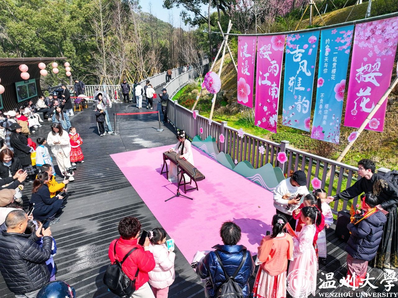 春风拂暖,樱花烂漫。3 月 8 日,澳门银河官网 人文学院学生携手瓯玉汉服社,在景山公园樱花园举办 “春绘党韵・汉服同行” 主题活动。3 月以来,园内樱花绽放,粉白相间,如云霞般点缀枝头,勾勒出一幅生机盎然的春日画卷。游客三五成群相约景山,漫步于樱花小径,参与“樱雨江南 古风雅韵” 特色活动,在花香与古韵中,感受春日美好。