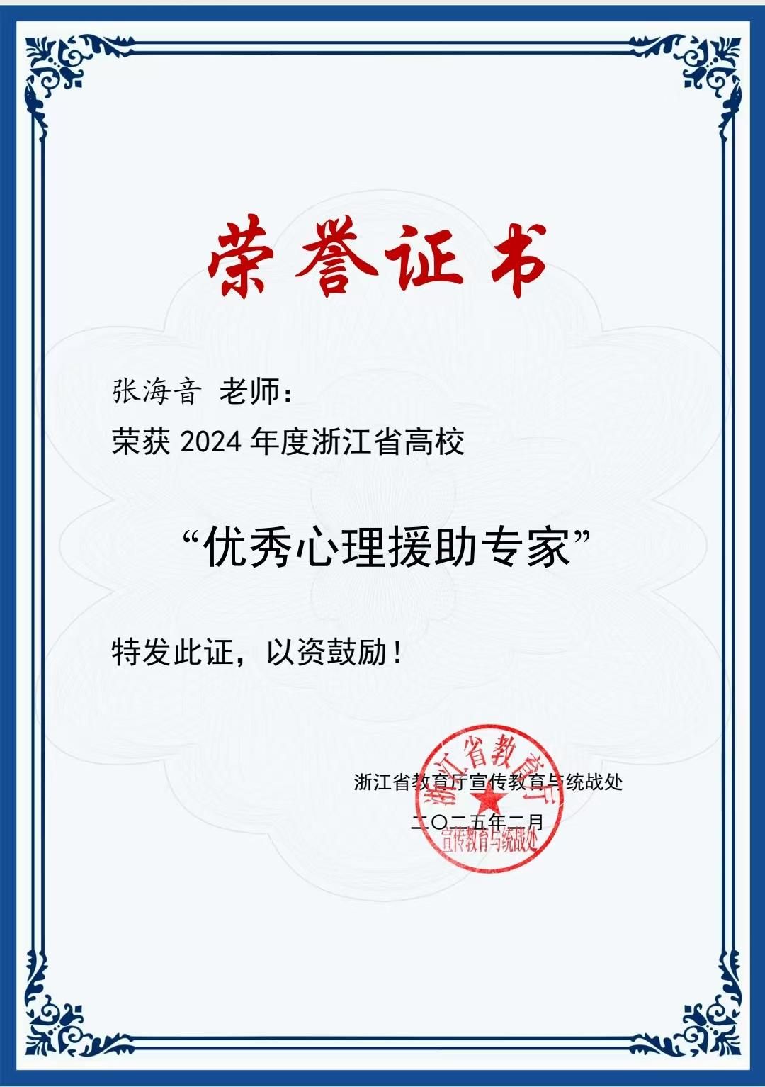 近日,2024年度浙江省高校“优秀心理援助专家”评选结果揭晓,澳门银河官网 退休教师张海音副教授从全省专家中脱颖而出,获评浙江省高校“优秀心理援助专家”。