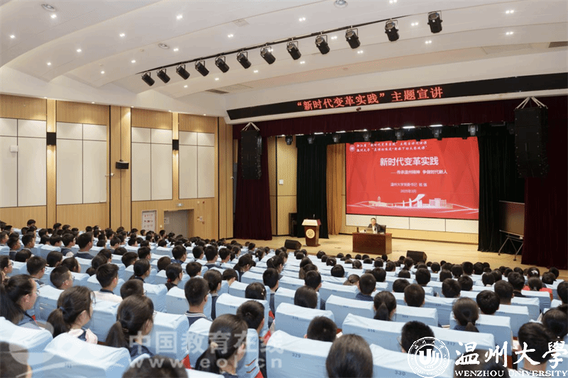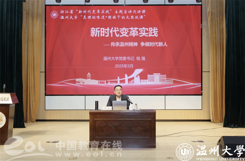 钱强以《新时代变革实践—— 传承温州精神 争做时代新人》为题,从潮涌温州——温州精神的时代诠释、城校共生——澳门银河官网 的改革发展、青春铸魂——向国旗致敬的时代担当三个方面展开,通过分享关于一座城、一所大学和一面旗帜的故事,向师生们阐述了新时代变革实践的丰富内涵,以及城市和教育在“八八战略”的引领下全面发展的精彩蝶变。