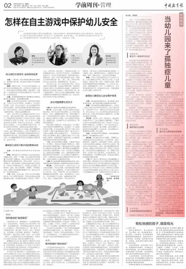 教研组将“与孤独症儿童言语互动宜采用的关键行为”教给教师,比如,“说话速度慢”“多描述而非提问”等。教师尝试在日常生活中与豆豆互动,并在集体活动时安排豆豆做与活动相关且他喜欢的事,从而给豆豆适应的时间。
