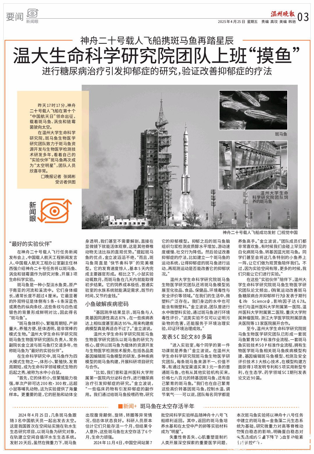 2024年4月25日,几位特殊“乘客”斑马鱼跟随3名航天员一起出发去太空。这是我国首次在空间站实施在轨水生生态研究项目,以斑马鱼为研究对象,在轨建立空间自循环水生生态系统。发射20天后,虽然在微重力下,斑马鱼出现腹背颠倒、旋转、转圈等异常情况,但总体状态良好。科研人员原本估计它们只能存活一个月,但结果令人意外,这些斑马鱼在太空存活了6个月,生命力顽强。2024年11月4日,中国空间站第7批空间科学实验样品随神舟十八号飞船顺利返回。其中,返回的斑马鱼培养水基和在太空中产的卵等实验材料成为“明星”。