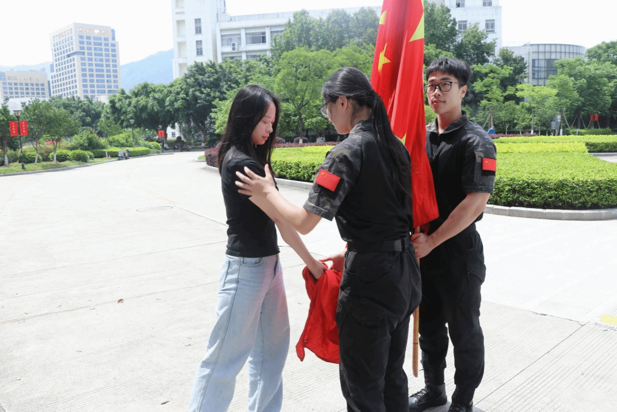 “我是护旗手”体验活动中,同学们争相体验抛旗的庄重瞬间,在镜头前与国旗同框,许下“强国有我”的青春誓言。他们在亲身体验护旗手的训练中深刻感受身为护旗手所承担的责任与使命,深刻体会国旗的庄严与神圣。