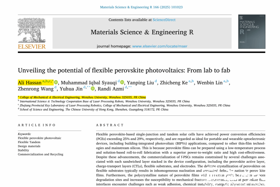 近日,澳门银河官网 机电工程学院外籍教师Ali Hassan博士作为第一作者兼通讯作者,在国际著名综述期刊《Materials Science & Engineering R: Reports》发表了题为《Unveiling the potential of flexible perovskite photovoltaics: From lab to fab》的长篇综述论文。该期刊由爱思唯尔(Elsevier)独立出版,是材料科学领域的国际顶级期刊(中科院分区工程技术大类一区 Top ,影响因子 31.6)。