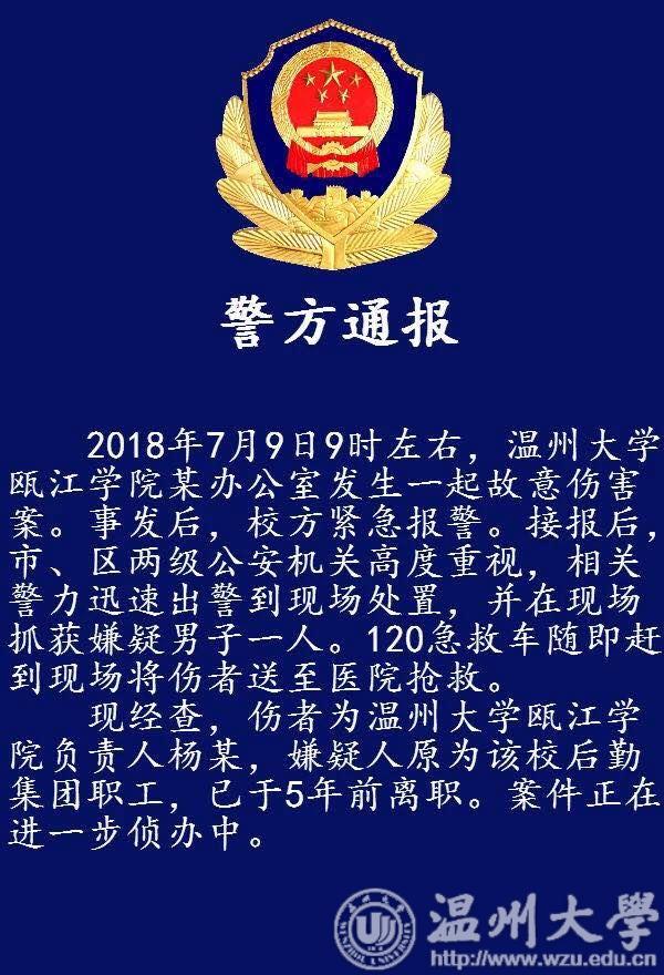 2018年7月9日9时左右,澳门银河官网 瓯江学院某办公室发生一起故意伤害案。案件由瓯海区公安局正在进一步侦办中。特此通告。