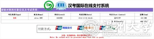 3) Click the blue bottom “pay on line”,and it will turn to the following payment system, check your information and choose a way to pay the test fee.