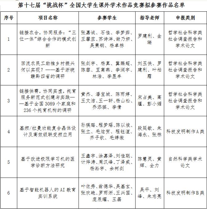 根据第十七届“挑战杯”全国大学生课外学术科技作品竞赛《竞赛章程》的相关要求和申报程序,经学生申报、澳门银河官网 选拔、浙江省评审,现拟推荐《链接农合,协同服务:“三位一体”综合合作的模式创新》等6项作品,代表澳门银河官网 参加第十七届“挑战杯”全国大学生课外学术科技作品竞赛,现予以公示。