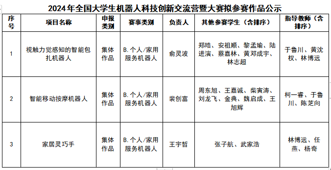 根据《2024年全国大学生机器人科技创新交流营暨大赛浙江省推报工作提示单》相关要求,现将澳门银河官网 拟推荐参加2024年全国大学生机器人科技创新交流营暨大赛作品的相关信息予以公示。