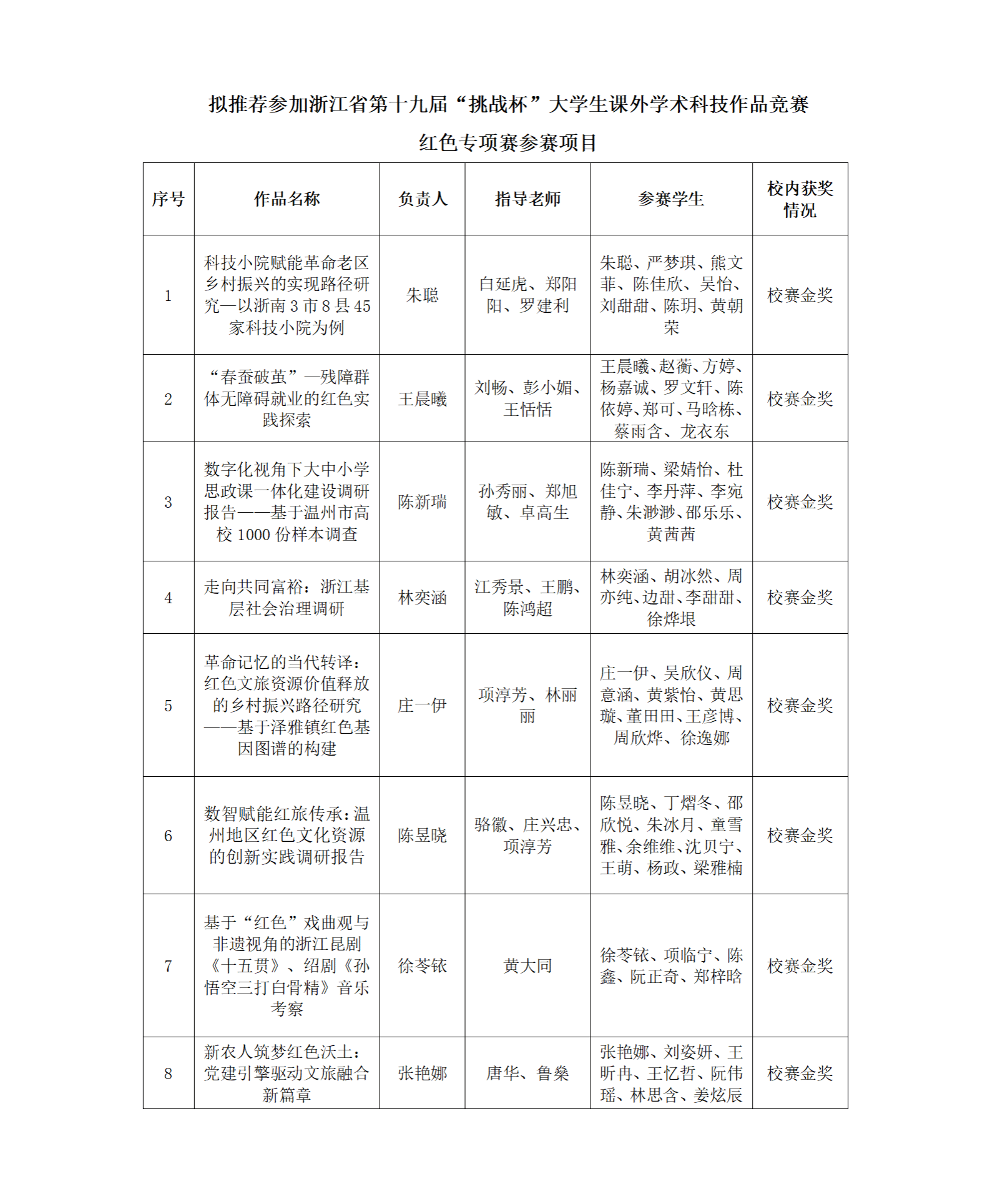 根据《关于组织开展浙江省第十九届“挑战杯”大学生课外学术科技作品竞赛红色专项赛的通知》相关要求,经澳门银河官网 “挑战杯”红色专项公开、公正、公平的选拔,现拟推荐《科技小院赋能革命老区乡村振兴的实现路径研究—以浙南3市8县45家科技小院为例》等8项作品代表澳门银河官网 参加浙江省第十九届“挑战杯”大学生课外学术科技作品竞赛红色专项赛。现将相关作品信息予以公示。