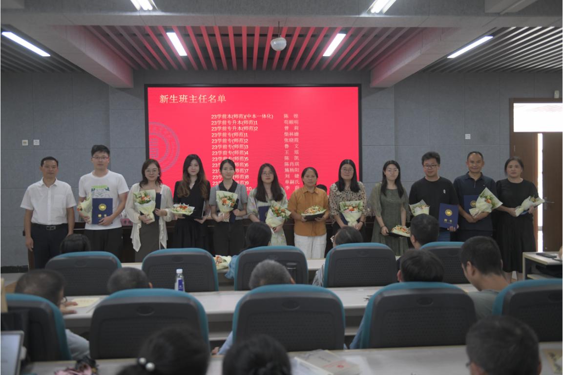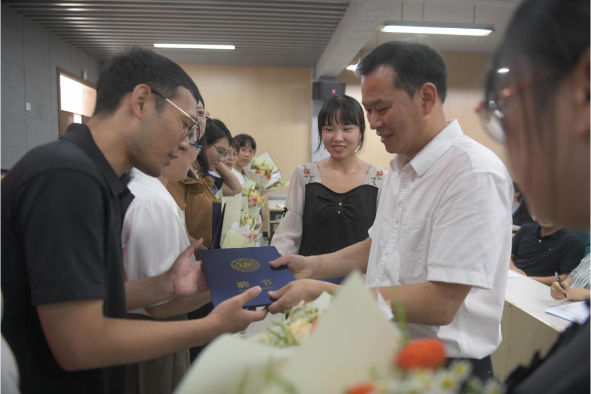 新教师入职仪式后,学院进行了新生班主任聘任。章园园副书记宣读2023级新生班主任聘任名单,何书记为龚婧等26位教师颁发新生班主任聘书,并合影留念。