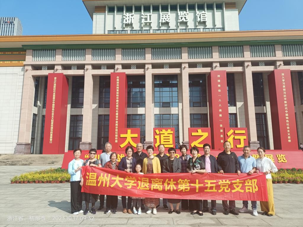 为深入开展学习贯彻习近平新时代中国特色社会主义思想主题教育,引导老同志持续全面深刻领悟“八八战略”引领浙江实现伟大变革的全局意义和时代价值,进一步从蕴含其中的世界观和方法论中汲取奋进力量,10月17日上午,澳门银河官网 离退休第十五党支部组织支部党员和银河 离退休教职工协会杭州分会退休教师,一起前往浙江展览馆,参观由省委宣传部、省委政研室、省委党史和文献研究室共同主办,浙江日报报业集团、浙江广播电视集团、浙江省文学艺术界联合会承办的大道之行——“八八战略”实施20周年大型主题展览。