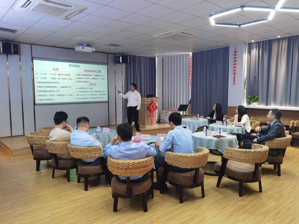 杨植院长从学院基本情况、学科特色、化学博士点建设、材料博士点培育等方面进行了介绍。姚韵靓院长对我院获批化学一级博士学位授予单位表示祝贺,认为我院学科实力强劲,专业平台良好,师资队伍强大,是对标学习的好目标,他向我院介绍了学院的基本情况、护理学科研究特色及博士点培育思路,并表示“申博”的成功是学科建设历史性的突破,我院成功申博的经验十分值得借鉴。随后双方就博士点申报经验及建设情况展开深入讨论,并希望今后能够进一步加强交流与合作。