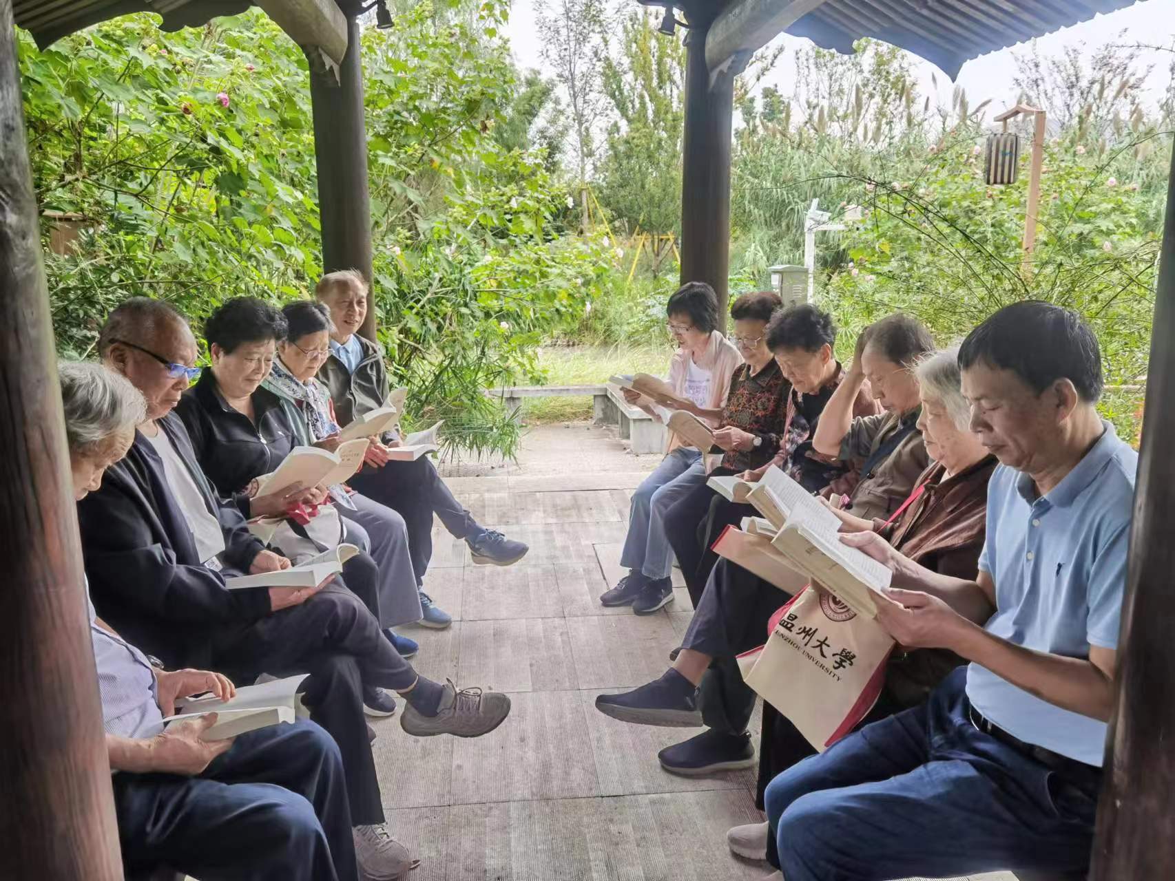 党员同志们在三垟湿地参观了“瓯江红党建人才综合体”,还在习近平总书记亲自种下的大榕树前集体合影,并在大榕树下现场开展主题教育理论学习。支部为党员们准备了《习近平新时代中国特色社会主义思想专题摘编》(以下简称《摘编》)一书和学习笔记本。支部书记刘希真传达了“关于澳门银河官网 离退休干部党员开展学习贯彻习近平新时代中国特色社会主义思想主题教育的通知”,并领学《摘编》的部分章节,同时组织党员同志们开展热烈又充分的学习体会交流。