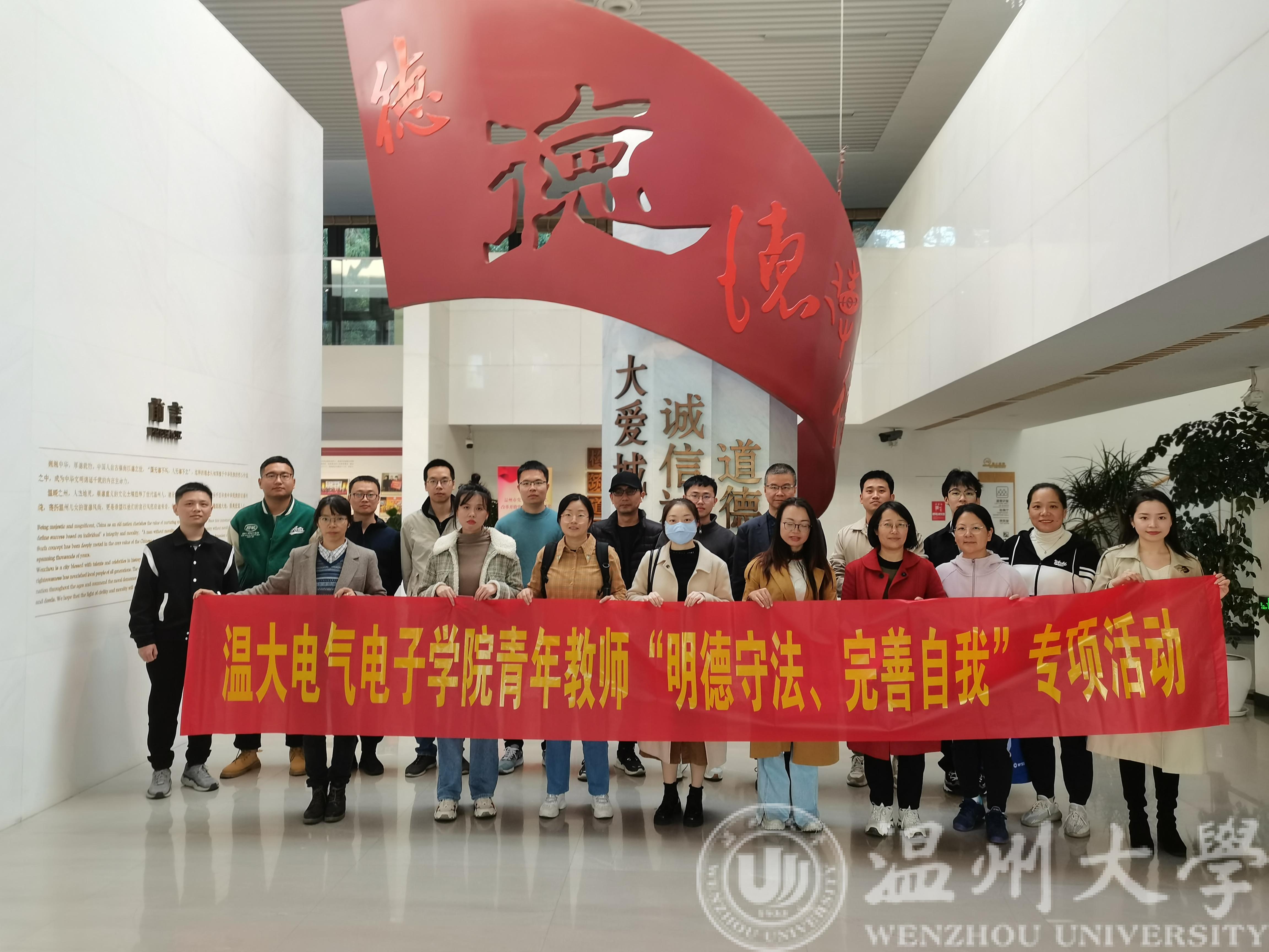 为深入学习贯彻习近平新时代中国特色社会主义思想和习近平总书记关于加强年轻干部教育管理监督重要指示精神,11月22日下午,我院组织20余名青年教师赴温州道德馆开展“明德守法、完善自我”主题教育专项活动,引导青年教师坚定理想信念、涵养道德操守、严守纪法规矩。