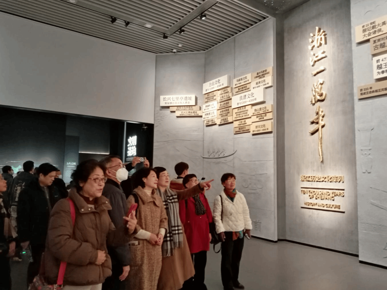 首先,全体党员一起参观浙江省博物馆之江馆新馆,深入感受“浙江一万年”宏伟历史。浙江博物馆之江馆新馆,位于杭州市西湖区之江文化中心,是融合了江南文化和历史的“宝藏”,是集收藏、保护、研究、展示、宣传、教育和文化体验于一体的现代化公共文化空间。该馆设有18个馆区,馆藏文物达十万余件,包括河姆渡文化的陶器、漆器、木器、骨器和象牙制品,良渚文化的玉器和丝织品,越国的青铜器,越窑、龙泉窑、南宋官窑等窑口的青瓷,会稽古铜镜和湖州古铜镜,明清浙籍书画家的作品等,均为闻名遐迩的文化瑰宝。该馆首次对浙江一万年历史文化谱系进行全面系统梳理,提炼出浙江万年百件大事记,并在通史陈列馆序厅展出。大家停留观看最久的是“浙江一万年——浙江历史文化陈列”。它系统展示了浙江最新的考古成果,包括长兴七里亭遗址、长兴太傅庙遗址、浦江上山遗址、义乌桥头遗址、余姚井头山遗址、余姚田螺山遗址、余姚施岙遗址、安吉古城遗址、衢江西周高等级土墩墓、温州朔门古港遗址等。之江新馆智慧工程项目结合3D数字空间建模、数字孪生、虚拟人、实时云渲染等技术,打造浙江一万年“云游览”模式,突破时间和空间限制,向群众提供更加人性化的体验和全天候文化服务,提高博物馆的亲和力、社会影响力。