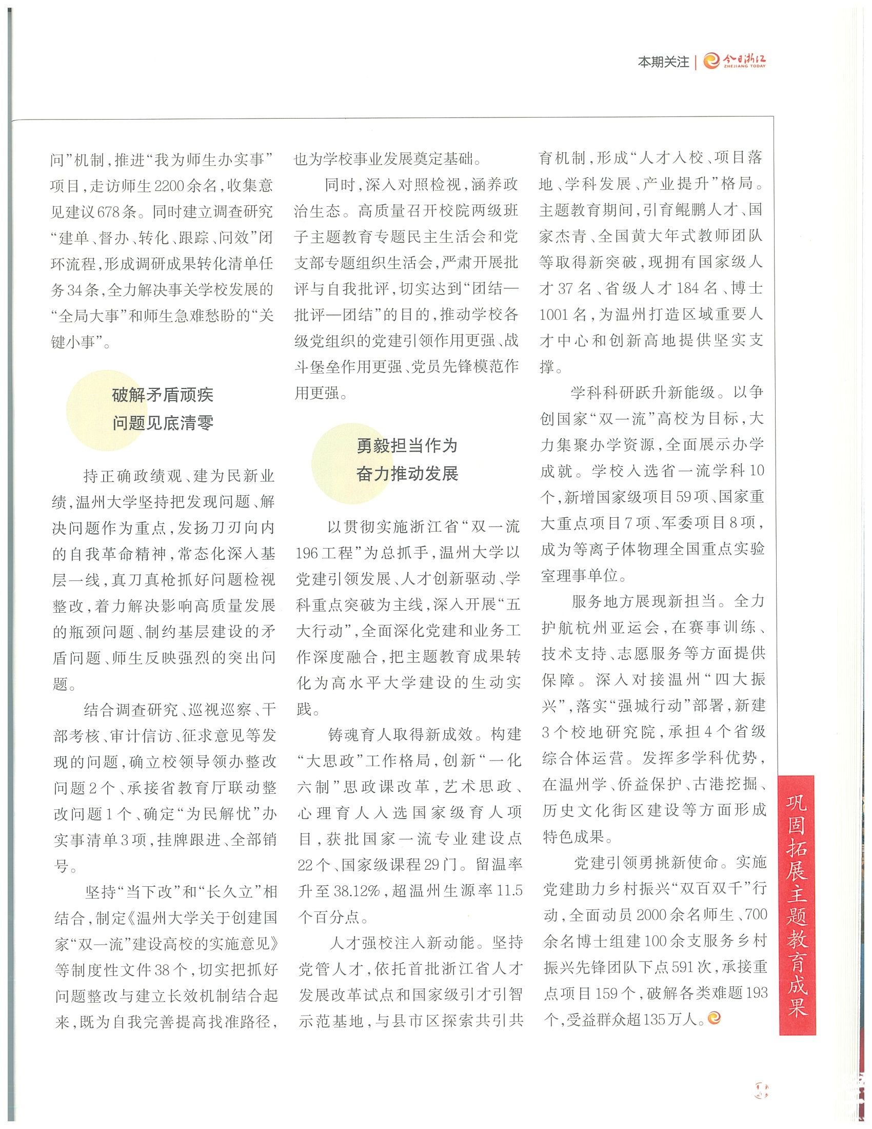 人才强校注入新动能。坚持党管人才,依托首批浙江省人才发展改革试点和国家级引才引智示范基地,与县市区探索共引共育机制,形成“人才入校、项目落地、学科发展、产业提升”格局。主题教育期间,引育鲲鹏人才、国家杰青、全国黄大年式教师团队等取得新突破,现拥有国家级人才37名、省级人才184名、博士1001名,为温州打造区域重要人才中心和创新高地提供坚实支撑。