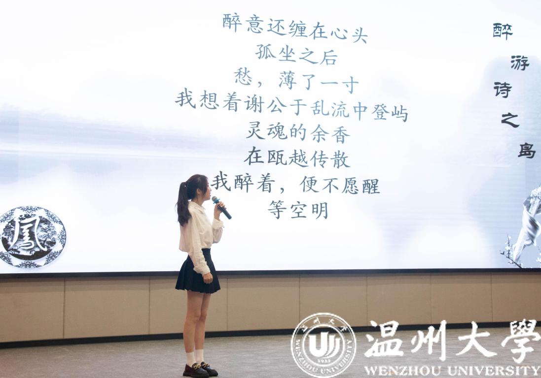 The competition was divided into two sessions, namely, original poetry recitation and poetry knowledge quiz. After the preliminary competition, 18 contestants from Wenzhou University and Wenzhou Business School were shortlisted for the finals. 8 students including Pan Jie from Wenzhou University won the award in the session of original poetry recitation.