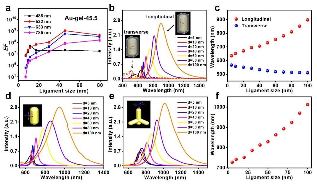 The researchers first of all prepared a range of gold aerogels with the feature size (nanowire diameter) of 5-100 nm. Research shows that SERRS enhancement factor (EF) can be affected by the feature size and excitation wavelength of gold aerogels. Under the same excitation wavelength, the enhancement factor has an optimal feature size. However along with the red shift of the excitation wavelength the corresponding optimal feature size also increases, which is also observed in many probe molecules. By adopting the finite difference time domain theory (FDTD) simulation and using gold nanorods or tetrapods as models, it can be clearly observed that with the increase of diameter, the absorption wavelength also gradually moves towards the long wave. From that we can infer that the resonant excitation wavelength of gold aerogels is positively correlated with the feature size, which can to some extent explain the mechanism of the dependence between SERS activity and the feature size of the excitation wavelength.