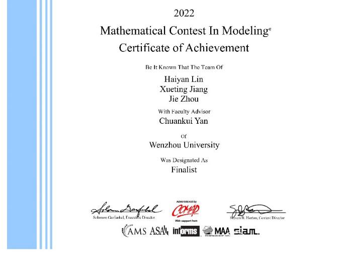 特别是由数理学院林海燕、计算机与人工智能学院蒋雪婷以及机电工程学院周洁三位同学组成的参赛团队,在指导师、数理学院严传魁老师的指导下,经过激烈的层层角逐,从全世界近3万组选手中脱颖而出,喜获特等奖提名奖(简称F奖),为澳门银河官网 实现该赛事的突破作出了积极贡献。