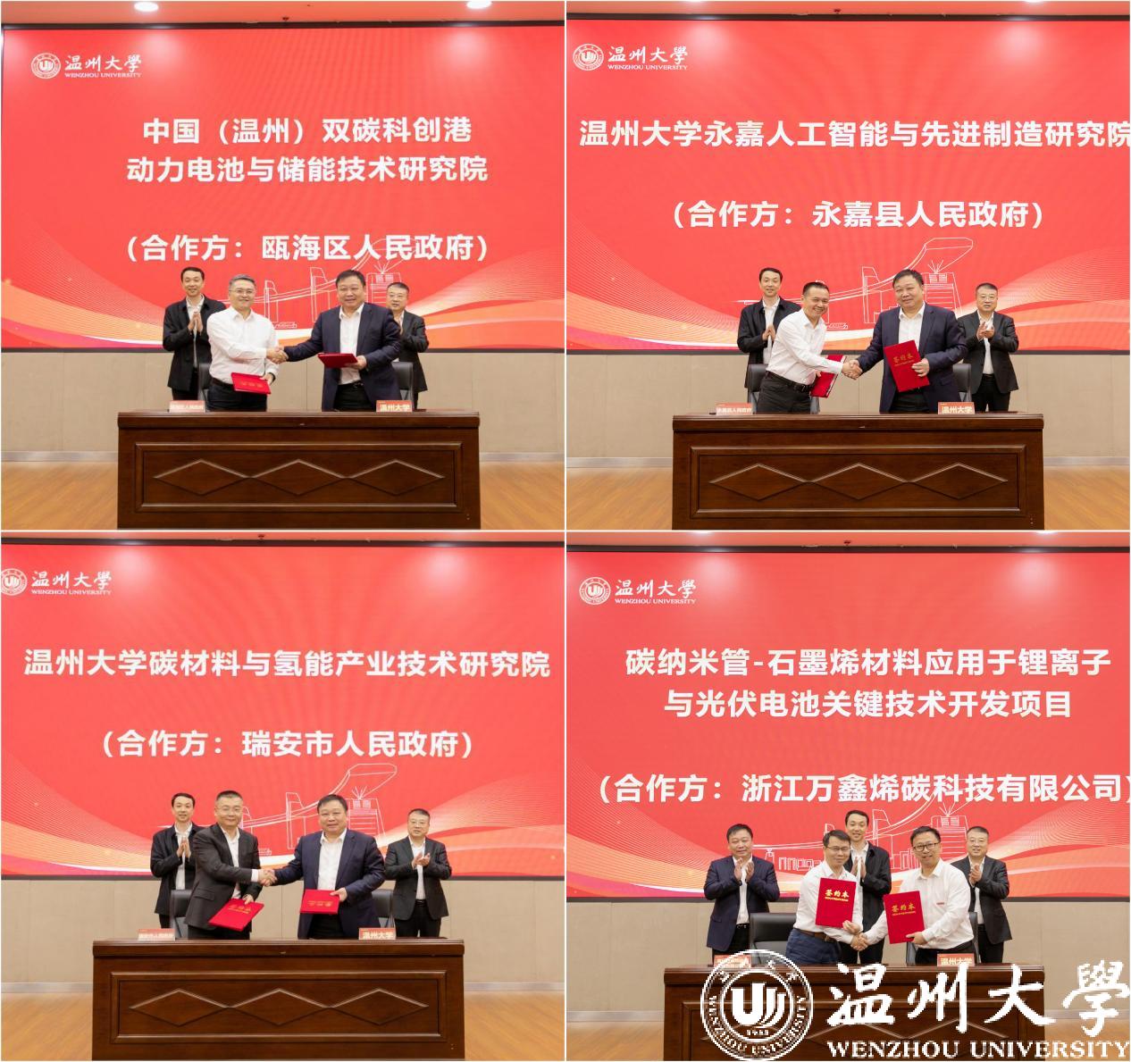 在重大项目集中签约仪式上,中国(温州)双碳科创港动力电池与储能技术研究院、澳门银河官网 碳材料与氢能产业技术研究院、澳门银河官网 永嘉人工智能与先进制造研究院等5个重大合作项目签约落地,总计合作经费超2亿元。