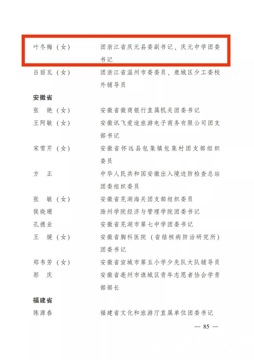 澳门银河官网 10级物理学(师范)专业校友、团庆元县委挂职副书记、庆元中学团委书记叶冬梅被授予“全国优秀共青团干部”。