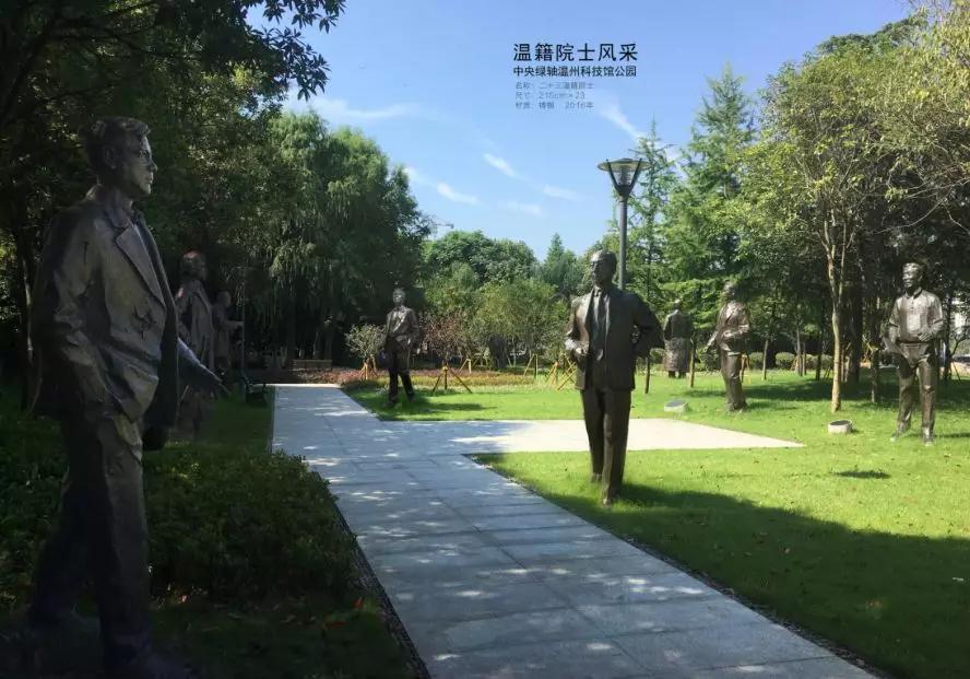 位于中央绿轴公园主园的雕塑《瓯居海中》为广大市民津津乐道。这座大型雕塑主体呈圆形,基座正方形,总高度达16.9米,黄铜材质,它与世纪广场的《世纪之光》玻璃塔大型雕塑遥相呼应,相映生辉。