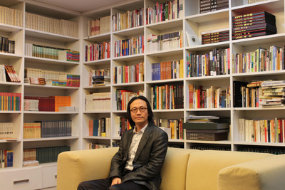进了他的办公室,严谨、整洁到每个细节的办公环境似乎和他不羁的气质有点出入。两间相连的办公室,一间是标准办公环境,另一间俨然是个小图书馆:书架倚墙而立,整整占据了两面墙。我们的采访就在他的“书房”内进行。“您看上去很有艺术家的气质。”,“目前中国人文教育的落后,致使我们的社会给予艺术家过高的地位,生活本身就是艺术,人要活得有艺术……”他靠向沙发,向后梳理着将要及肩的长发。我们都笑起来,开场白如此生动,其率真不羁的本色显露无遗,我原本紧张的心情放松了。